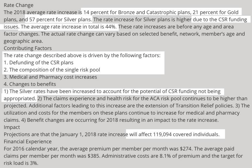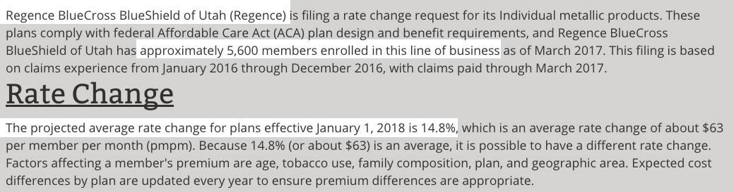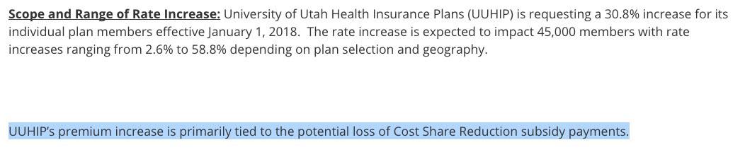 These are also the only two carriers which are impacted by the Cost Sharing Reduction issue, but it makes a pretty significant difference: Both SelectHealth and University of Utah specifically list CSR reimbursements as the primary reason for their rate hikes. They didn't give hard numbers, but according to the Kaiser Family Foundation, 15 points of the Silver rate hikes are due to CSRs; spread out across all metal levels, that translates into roughly 10.9%.