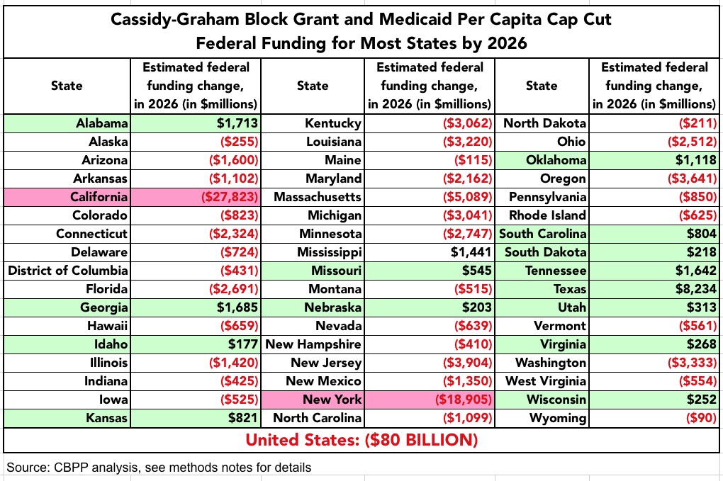 I also took the liberty of reformatting the Center on Budget and Policy Priorities projections of how much funding each state would gain or lose in 2026 if Graham-Cassidy were to become law. By an amazing coincidence, all 15 of the states which would gain gobs of money refused to expand Medicaid under the ACA, and 14 of the 15 just happen to be completely GOP-controlled (and the 15th, Virginia, has a Democratic Governor but his attempt at expanding Medicaid was blocked by a Republican state legislature). Meanwhile, again, by an amazing coincidence, California and New York "just happen" to lose tens of billions of dollars each. This is a blatant, offensively obvious attempt to simply steal billions of dollars from blue states in order to dole it out to red states. There's no other way of putting it.