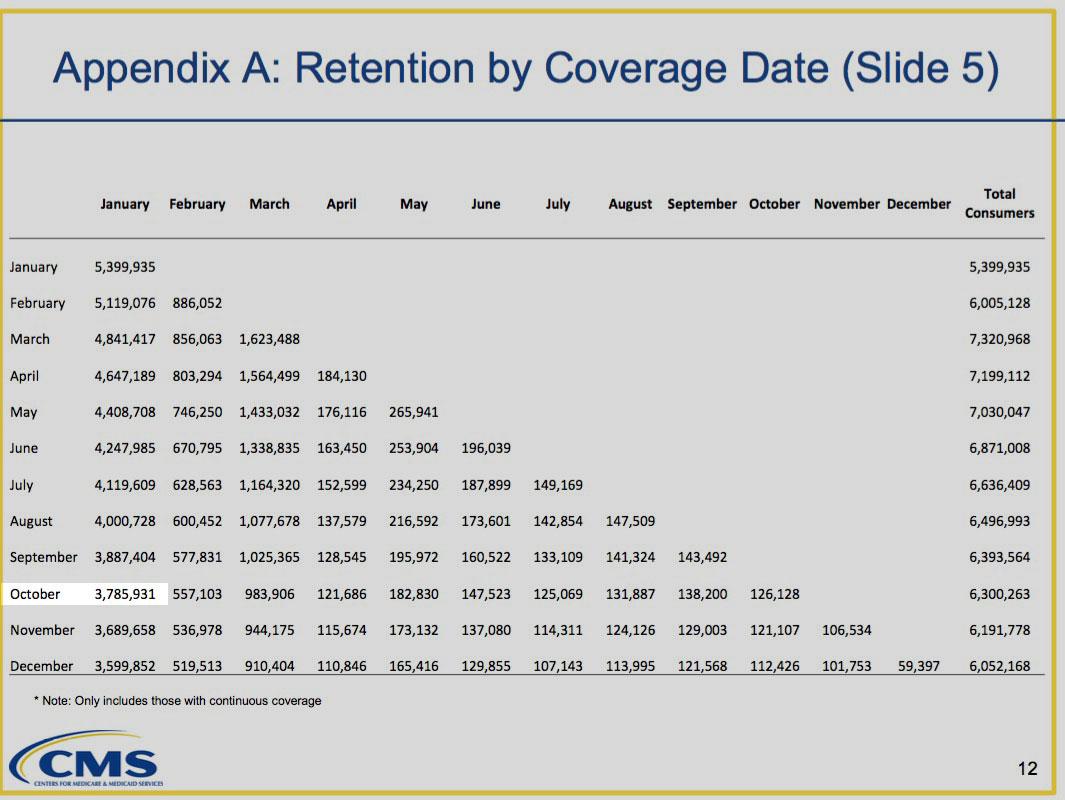 - In 2014, it was down to 6.70 million from 8.02 million (83.5% retention from May...remember, the first open enrollment period didn't end until mid-April anyway)