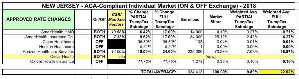 Still, sabotage is sabotage. As for the other three off-exchange-only carriers (Cigna, Oxford and another division of Horizon), they only have about 1,300 enrollees between them, so even though I don't know what their approved rate increases are, it wouldn't be more than a rounding error no matter how high or low it is.