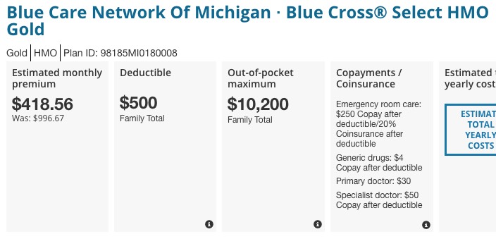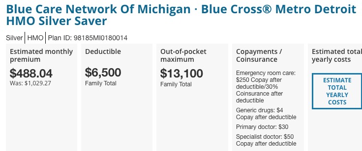 Here's what that does for this family next year. The "Meridian Choice" plan is no longer the benchmark Silver; the price for that plan has increased by $91/month...but the new Benchmark Silver, BCN's "Blue Cross Detroit Silver Saver", only costs $488/month...just a couple dollars more than the Meridian does this year. In addition, the deductible on the new benchmark plan is $4,300 lower than the Meridian plan is this year. this family would probably be better off switching to it, assuming their doctors/hospitals are still in network: