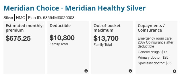 For 2017, that Meridian Choice Silver plan costs them the full $675/month, with the $10,800 deductible: