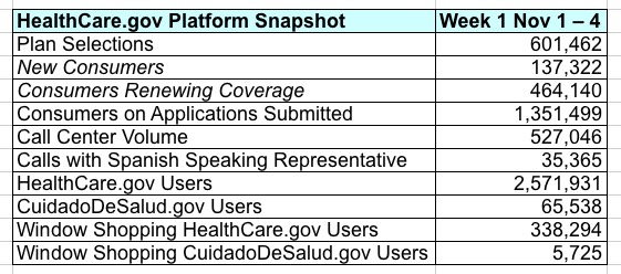 This also means that I've now cofirmed a total of at least 654,000 QHP selections nationally in the first few days when you include the 6 additional state-based exchanges which have also reported early data (the other 6 haven't reported anything yet). It's important to remember that the other 54,000 only include 6 states, but also mostly only include a single day (Nov. 1st), so the actual national total through the first 4 days is probably closer to 700,000 or so.