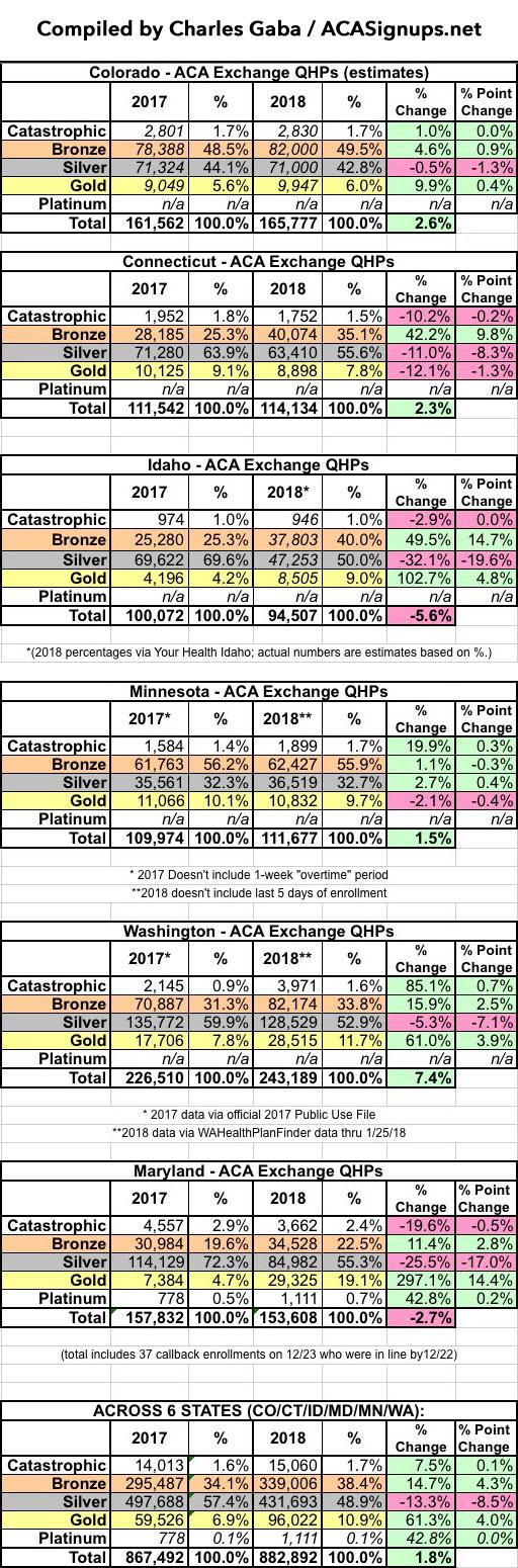 So far I've dug up final (or near final) data for six states: Colorado, Connecticut, Idaho, Maryland, Minnesota and Washington State. Collectively, these states only represent about 890,000 2018 exchange enrollees, or roughly 7.5% of the 11.8 million total, so I have no idea how representative they are nationally, but it's all I have to work with for the moment.