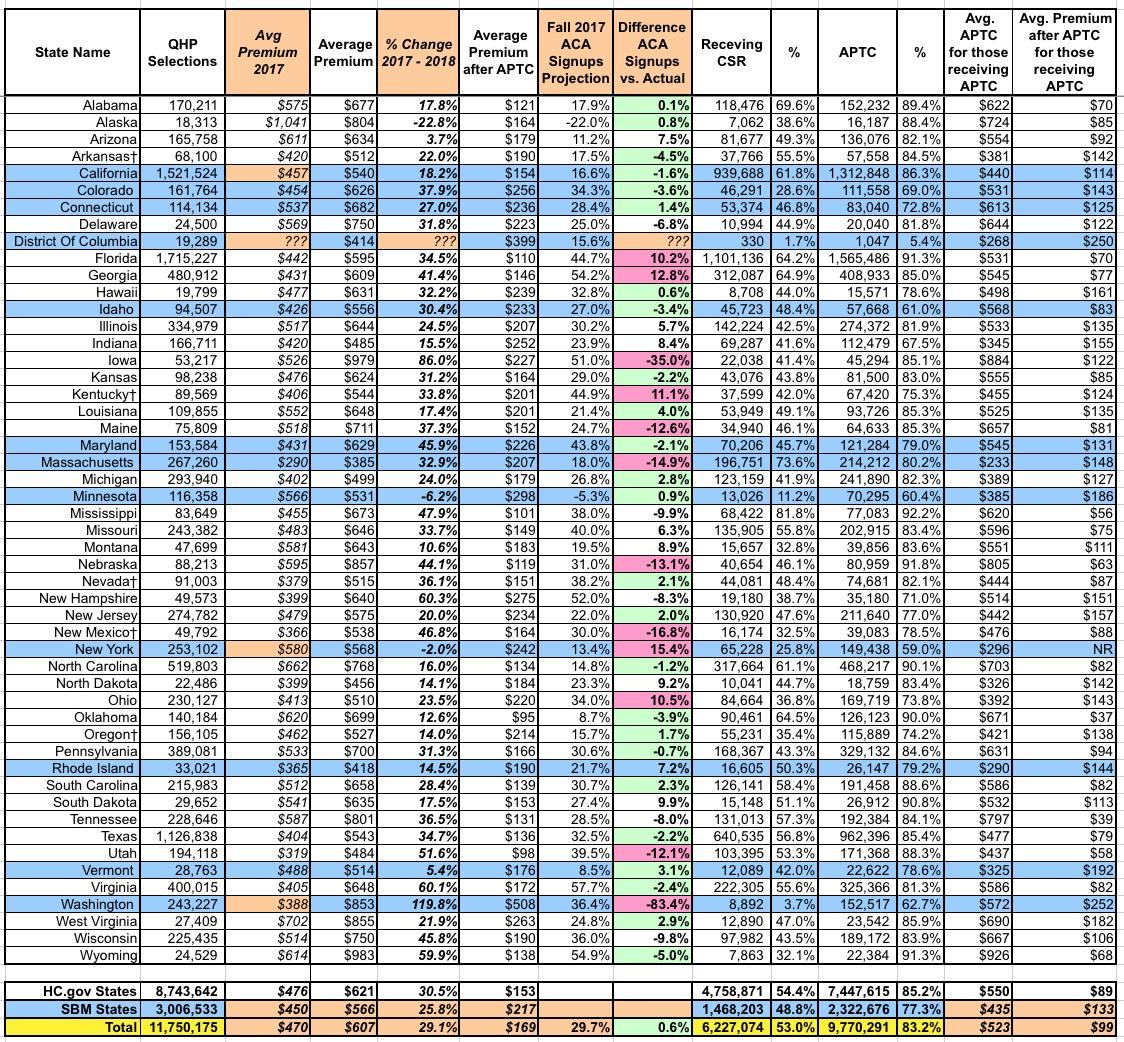 Yesterday afternoon, however, the Centers for Medicare and Medicaid finally released the official 2018 Open Enrollment Period report with all sorts of demographic data breakouts by state. By comparing the 2018 enrollment numbers, premiums, tax credits and so forth against the 2017 data, I could fine-tune this comparison more accurately.