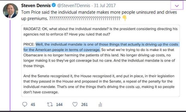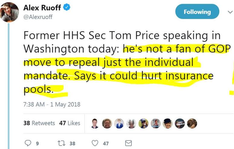 Price says that he's not a big fan of the GOP tax bill's 2019 individual mandate repeal-- says it will harm the pool in the exchange markets & drive up costs