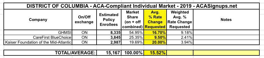 District of Columbia: Preliminary 2019 ACA rate hike request: 15.5%, "significant impact" from mandate repeal