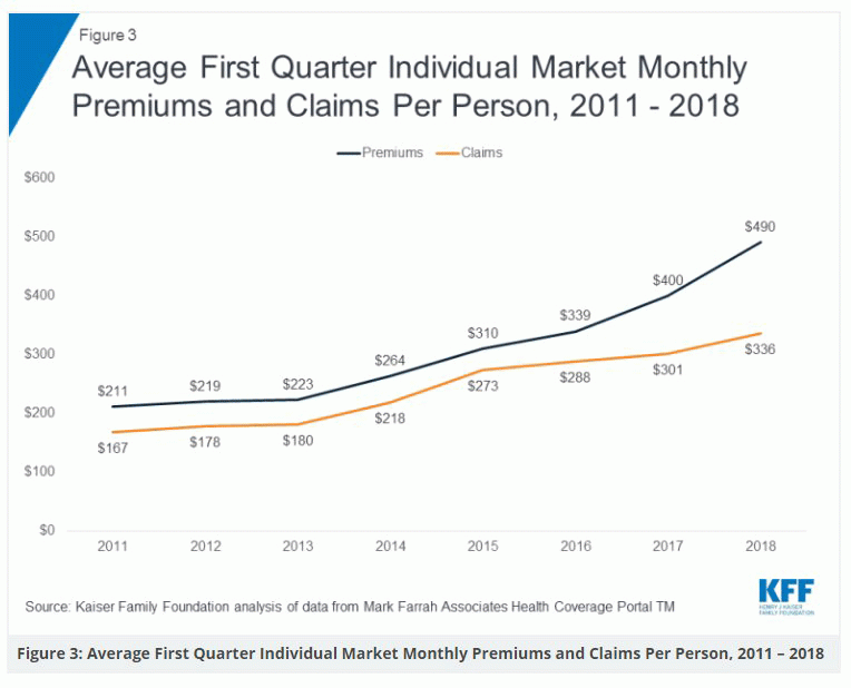 Below is an admittedly crude graph showing how average monthly premiums and claims have increased on the individual market over the years since the ACA went into effect. The data for 2011-2017 comes from this earlier, full-year analysis by Kaiser (based on data from Mark Farrah Associates), while the data for 2018 and 2019 is a combination of hard data from CMS, the actual rate filing data I've analysed above and projections based on estimates by the Urban Institute and the carriers themselves.