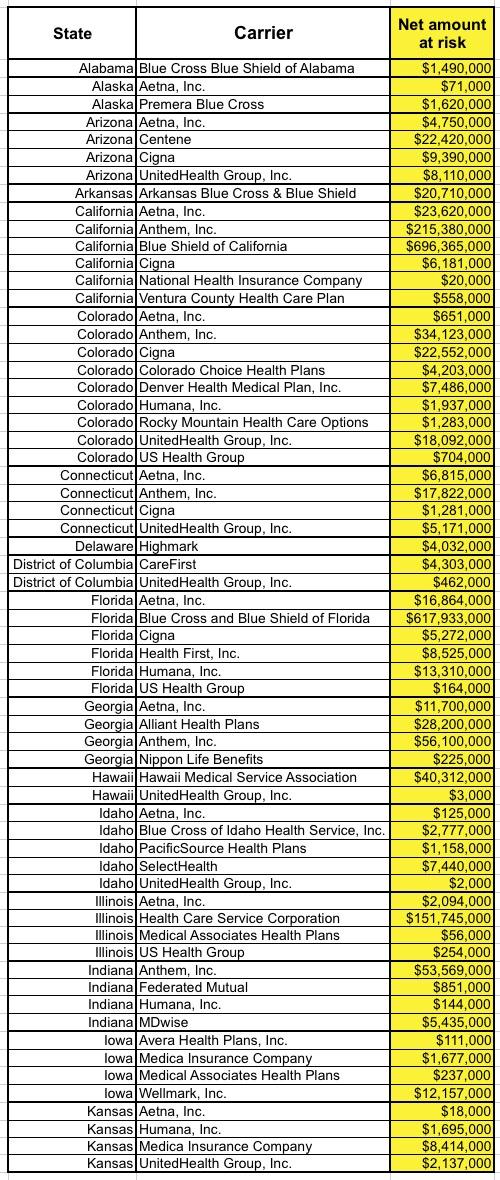 There's a lot of examples of this. And yes, I went ahead and went thorugh all 610 carrier listings and combined the various multiple entries for the same carrier to get this: A full listing of the net 2017 funds which carriers are at risk of losing (or at least of being frozen for awhile). I didn't bother with the other side of the coin, since those carriers aren't any worse off than they otherwise would be (at least in theory). All told, out of 610 listings, 184 carriers are actually owed money (fewer, really, if you only count national carriers once...Aetna, Inc. has listings in 25 states even after you combine the in-state divisions, for instance.