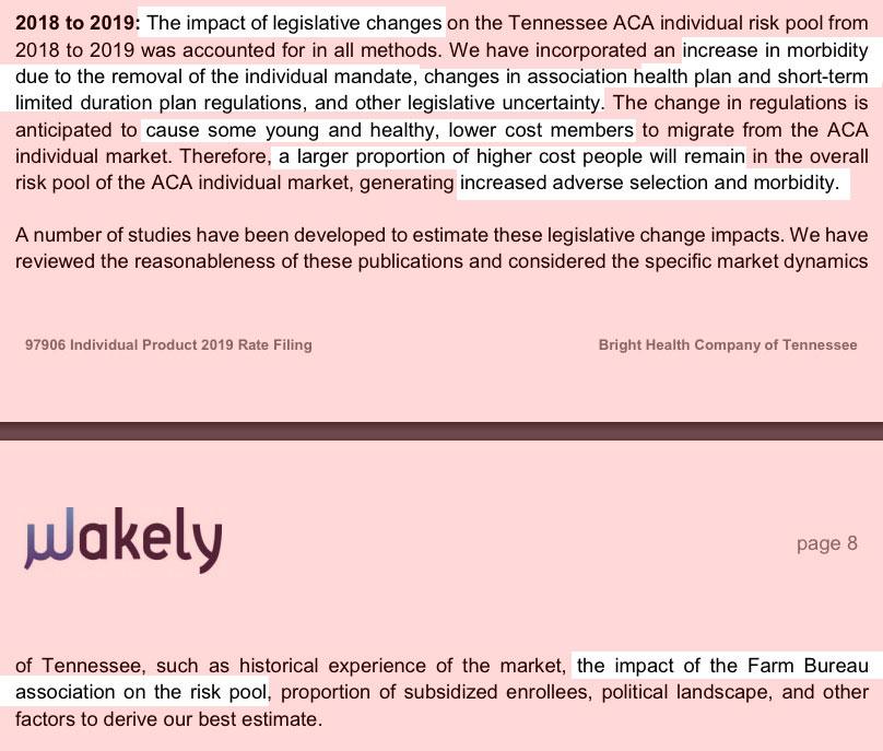 Remember, the RA thing is on top of the other big sabotage factors this year: Repeal of the ACA's individual mandate and the expansion of #ShortAssPlans. Those are, as usual, specifically called out by most of the TN carriers as well. None of them break the impact out specifically, so I'm once again using my standard estimate: 2/3 of what the Urban Institute projected these factors to be. In the case of Tennessee, Urban estimated around 18.1 percentage points would be tacked on, so I'm assuming this to be around 12 points to err on the side of caution.