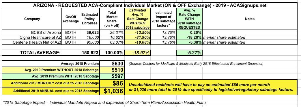 Arizona: Preliminary 2019 #ACA rates: 5.3% DROP, but would have dropped up to ~19% w/out #ACASabotage