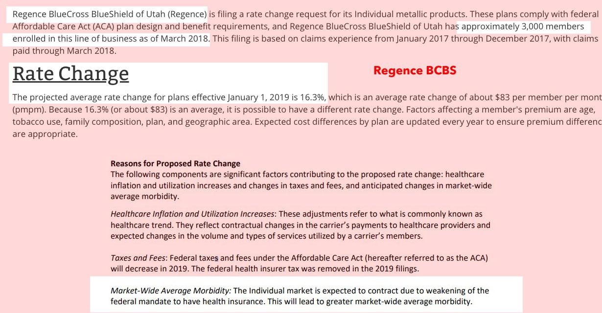 Having said that, there's one interesting extra sabotage factor to consider for the University of Utah rate filing: They note that they've added an extra 10.3% to their 2019 rates specifically tied to last year's Cost Sharing Reduction (CSR) cut-off. I presume they chose not to bake the CSR load into their rates this year, but I don't think Utah went the "mixed load" route so who knows?