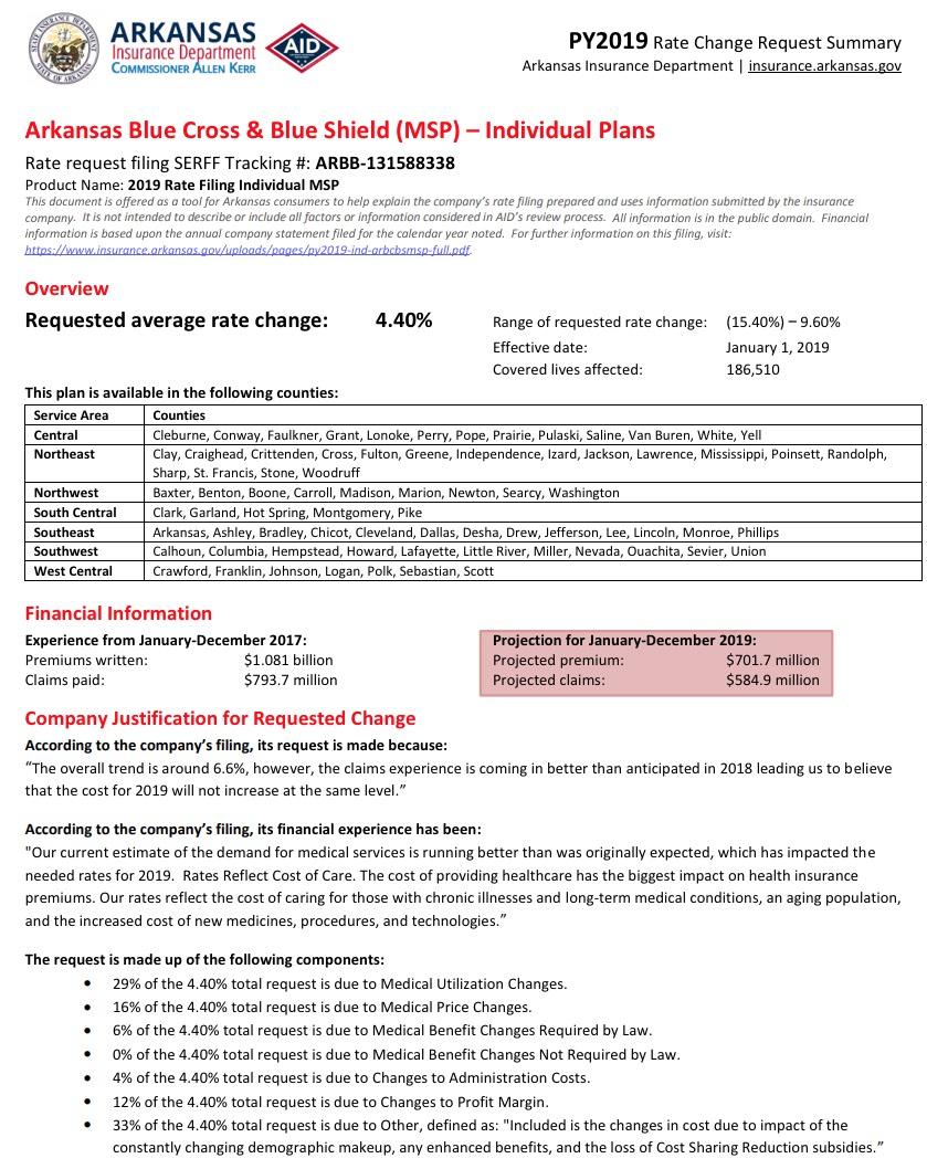 With the deadline for submitting 2019 rate filings having passed a week or so ago, the approved rates from the various state insurance regulators have been popping up left and right. Today I took a look at the Arkansas Insurance Dept. website and sure enough, they've posted the approved filings for all 4 carriers on the individual market (as well as the small group market).