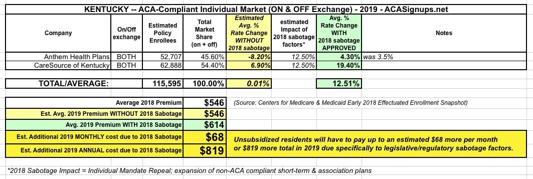 Hat tip to Louise Norris for the heads up about the Kentucky Dept. of Insurance issuing their final rulings for 2019 ACA individual market and small group policy premiums:
