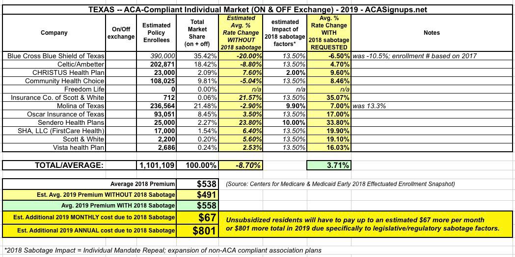 Texas: UPDATED avg. 2019 #ACA rate hikes: 3.7%, would likely DROP 8.7% w/out #ACASabotage