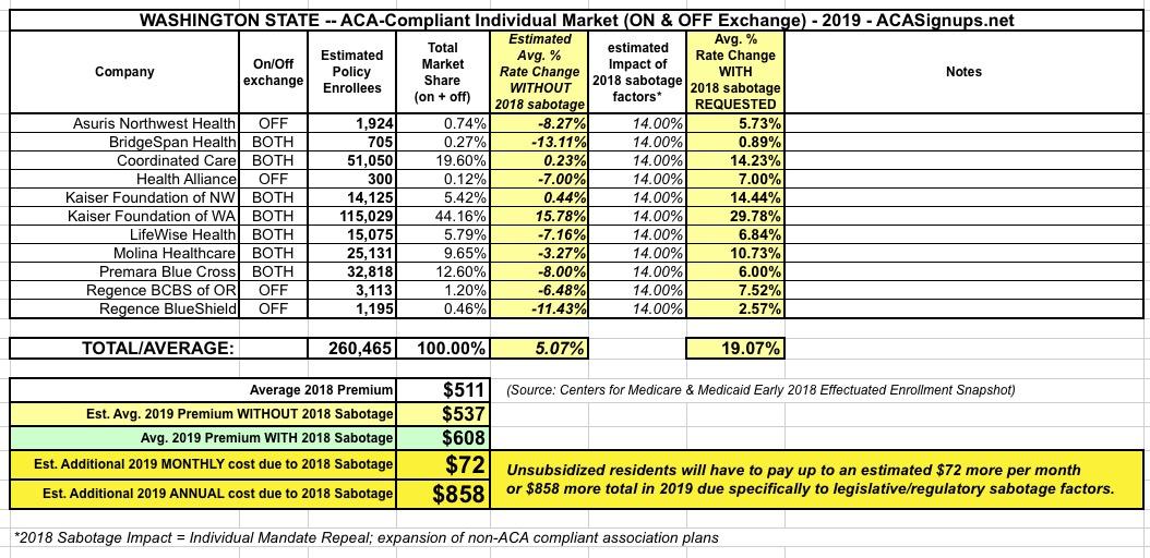 Back in June, Washington State delivered the bad news: They were expecting 2019 ACA-compliant premiums to increase by another 19.1% (due primarily to this year's sabotage of the law by Donald Trump and Congressional Republicans) on top of this year's 36% increase (10 points of which was due specifically to Trump's CSR reimbursement cut-off).