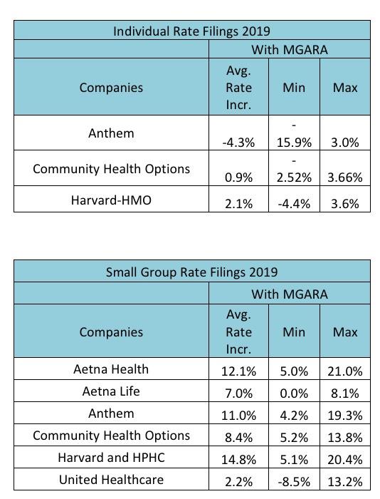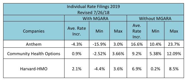 IMPORTANT: While the the actuarial analysis projects a 9% average premium drop thanks to the MGARA program, the carriers themselves have already chimed in and say that it will only lower their 2019 rates by around 3.4 percentage points. Until I hear otherwise from the carriers or the state insurance department, I'll assume a 3.4 point impact.