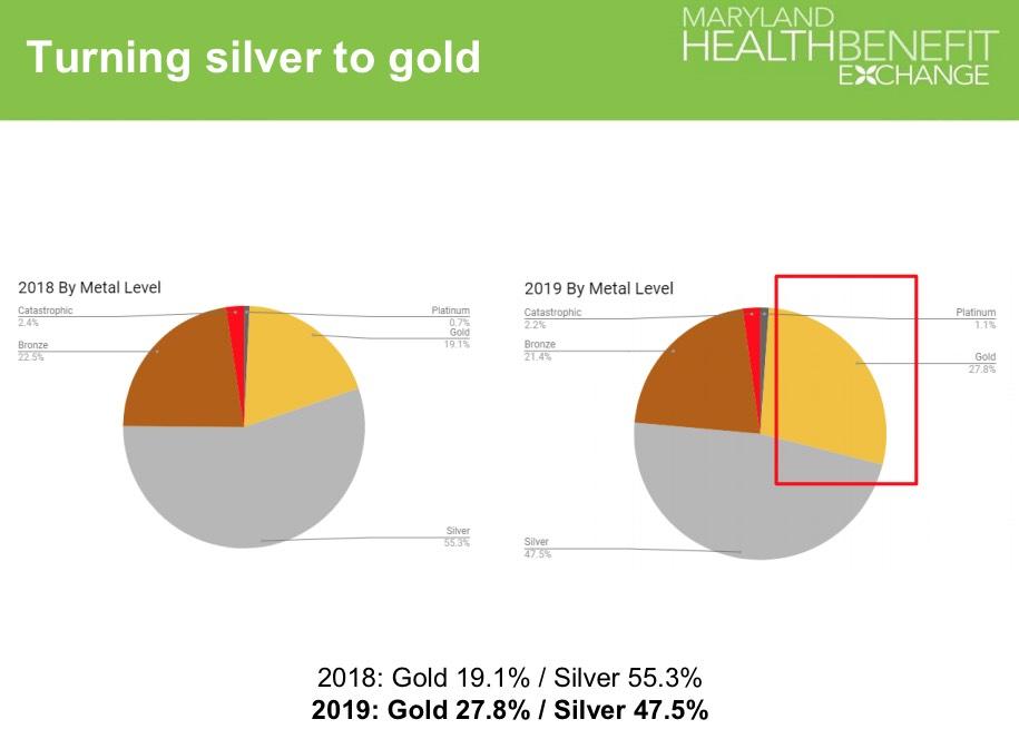 And sure enough, here's the results...that's roughly 12,000 Maryland enrollees who switched from Silver to Gold. It's also likely that a large chunk of the 28,600 increase in off-exchange enrollment came from on-exchange enrollees who took advantage of the #SilverSwitcharoo by moving to off-exchange plans as noted above...which makes Maryland's 2.2% on-exchange increase that much more impressive.