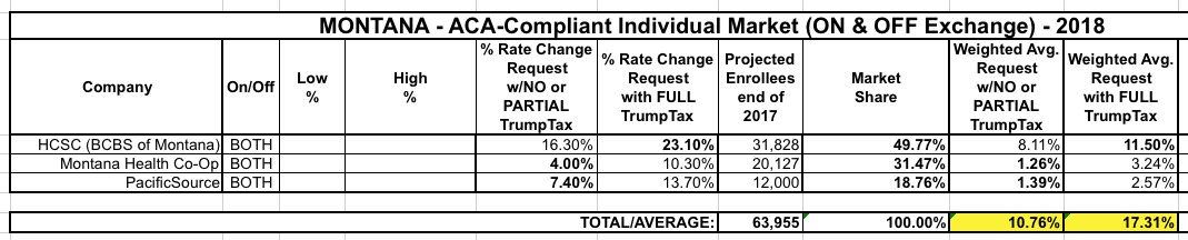 CORRECTION: I've been informed that unlike the other two carriers, BCBSMT's 23.1% request assumes that CSR payments won't be made. This dramatically lowers both weighted averages, to just 7.7% without a TrumpTax or 20.7% with the TrumpTax.