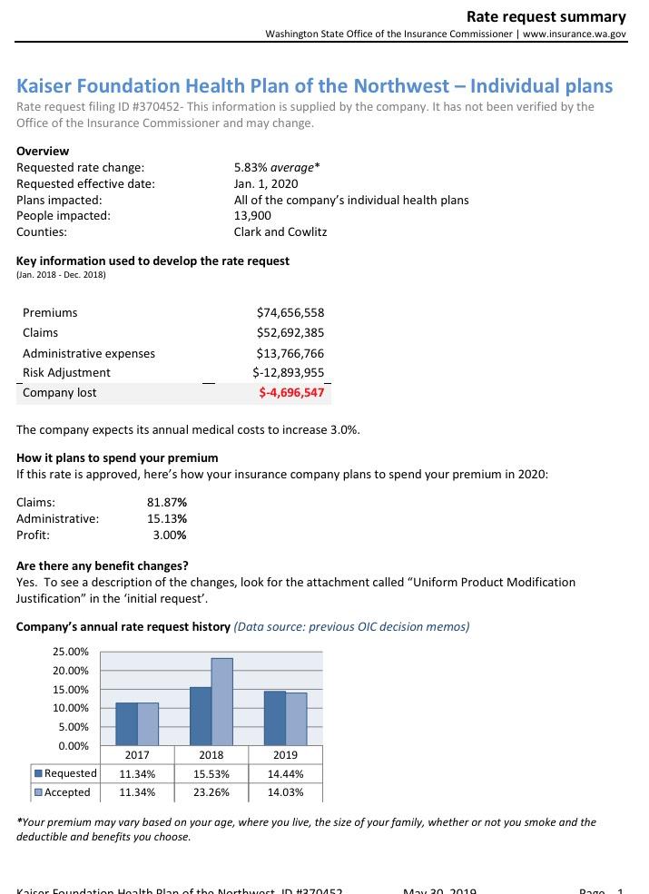 When I plug the hard numbers in from all of the insurers based on the rate filing summaries, I get a slightly higher weighted average of 1.43% instead of 0.96%, but that's pretty nominal and could be accounted for by several factors. Also, the grand total enrollment comes in at just 214,000 instead of the 248,000 noted in the press release; I'm not sure where the other 34,000 enrollees are...perhaps they're the last remnants of grandfathered plan enrollees? I did see one 2020 filing listing 6,300 enrollees in grandfathered LifeWise policies; it's possible that the other 28,000 or so are in grandfathered policies which aren't being renewed.