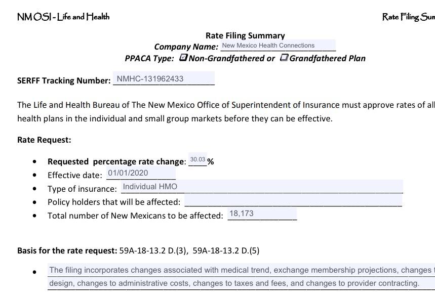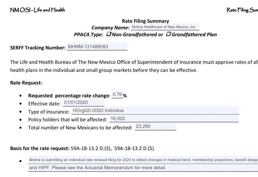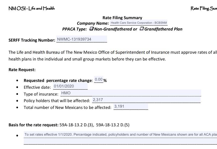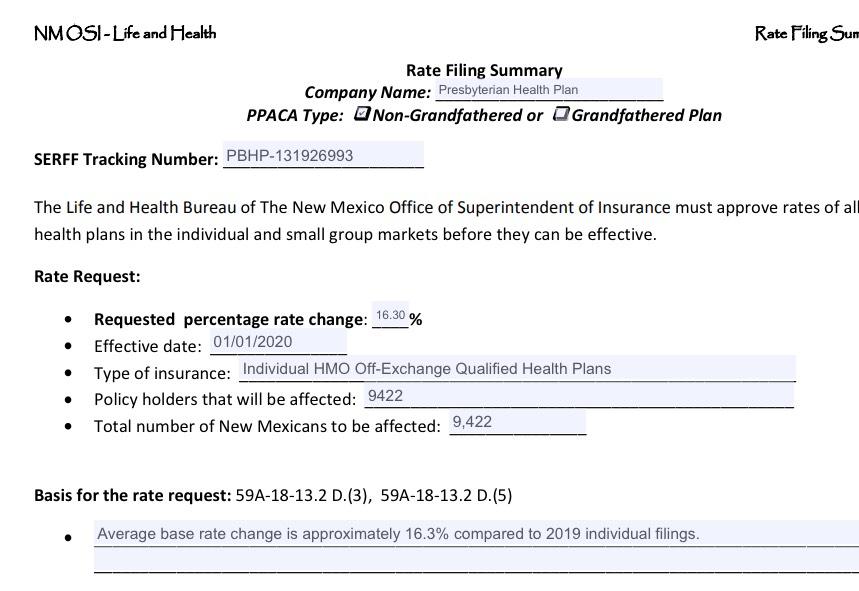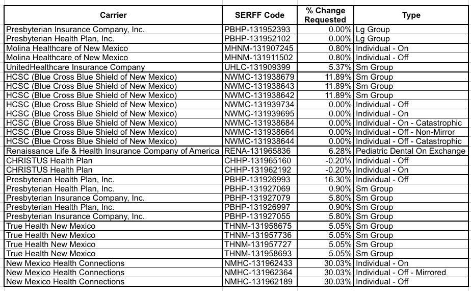 The New Mexico Office of the Superintendent of Insurance website just posted the preliminary 2020 insurance rate filings. Here's the full list, which includes a mish-mash of Individual Market, Large Group and Small Group Market policies, with a Pediatric Dental standalone plan thrown in as well.
