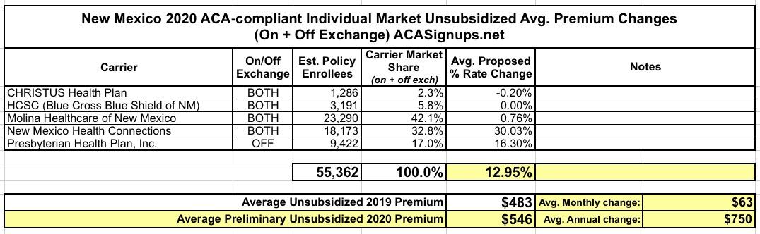 New Mexico: PRELIMINARY 2020 ACA Exchange Premium Rate Changes: 13.0% increase
