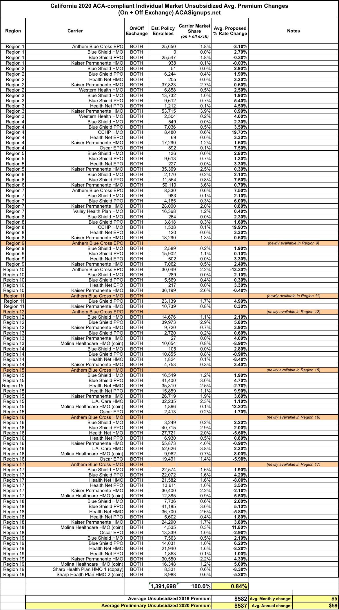 I actually went through the detailed breakout for all 19 regions in the state and compiled the full weighted average rate changes for the entire on-exchange ACA individual market...and sure enough, it comes out at +0.84%. They don't include the enrollment numbers for the off-exchange portion of the individual market (around 800,000 people), but I'm assuming that the market share breakout is fairly close to the on-exchange portion since CoveredCA insists that 0.8% refers to the entire market, on & off combined:
