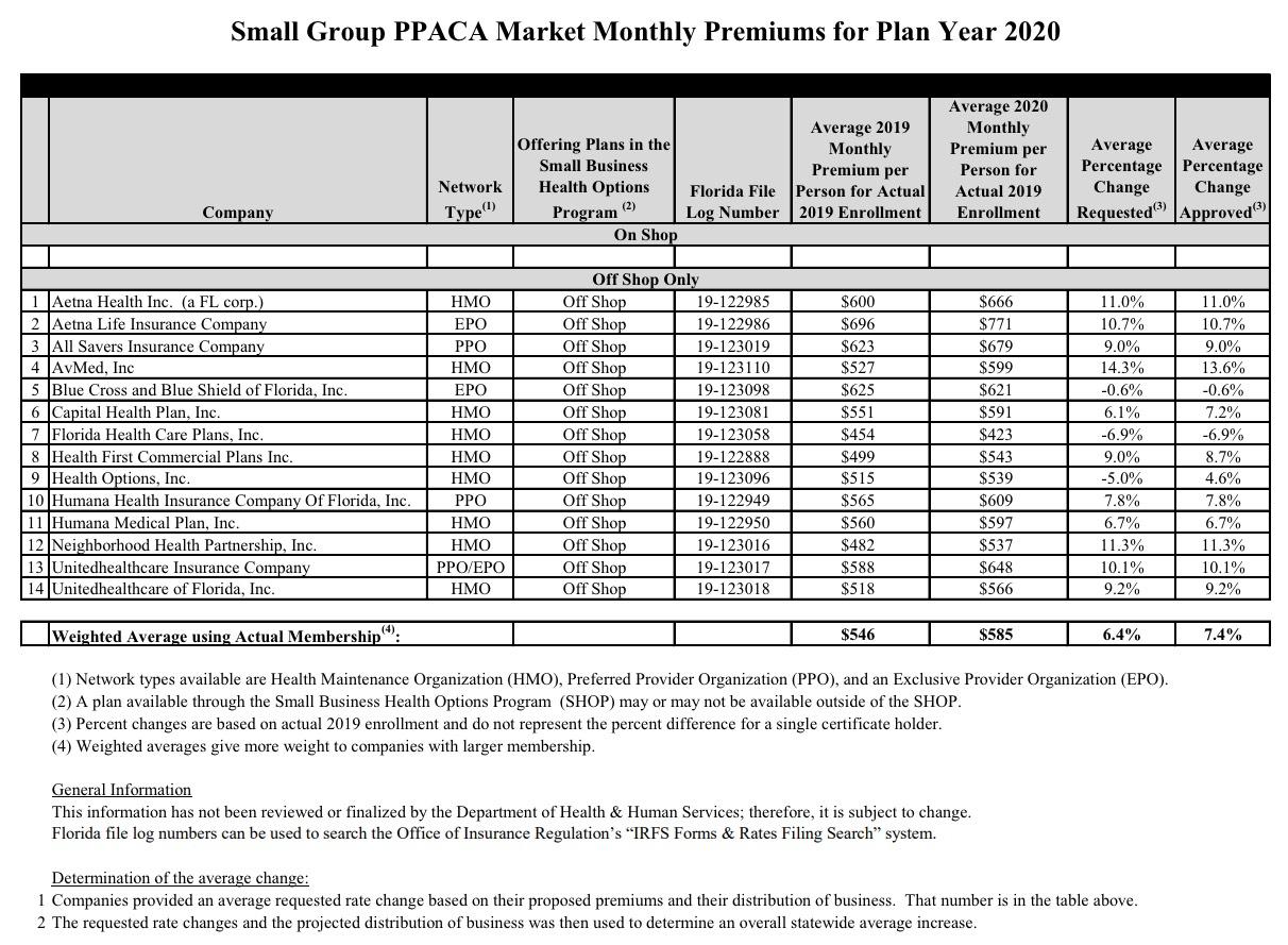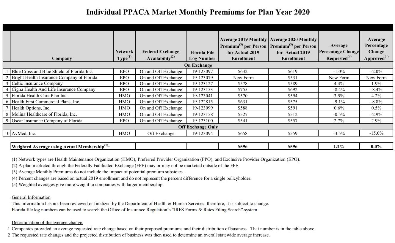 TALLAHASSEE, Fla. – The Florida Office of Insurance Regulation (OIR) announced today that premiums for Florida individual major medical plans in compliance with the federal Patient Protection & Affordable Care Act (PPACA) have been approved. Following OIR’s rate filing review, the average state-wide approved rate change on the Exchange is 0.0 percent beginning January 1, 2020.