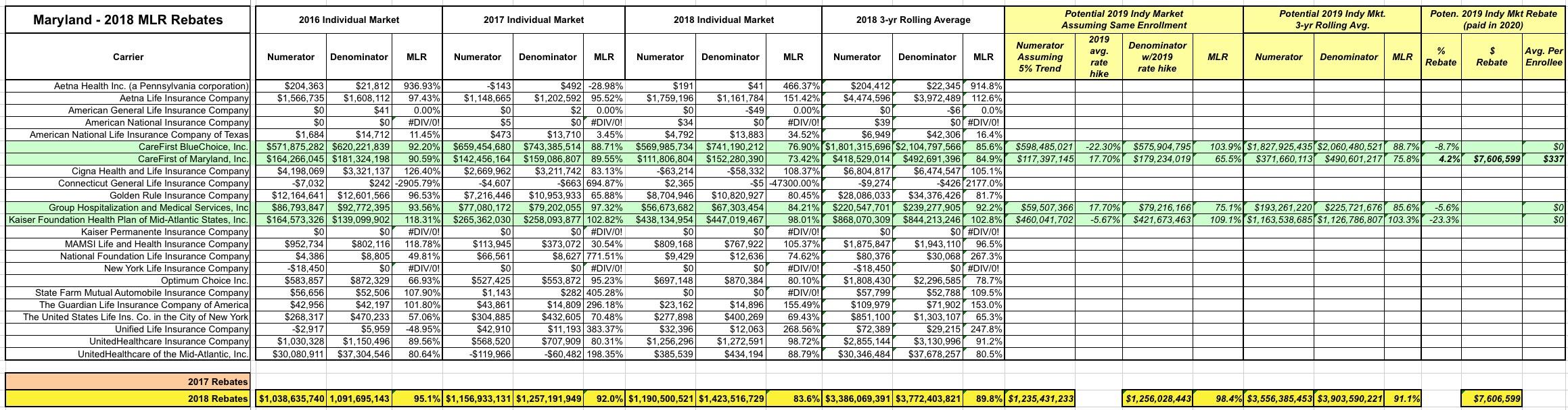 In 2020, on the other hand, there could be a solid Indy Market rebate of as much as $7.6 million, due specifically to CareFirst of Maryland raising their rates 17.7% this year. This struck me as odd given that they already ran a 73.4% MLR in 2018 and that the state implemented a robust reinsurance program (which caused CareFirst BlueChoice to drop their rates by over 22%), but it is what it is; we'll see:
