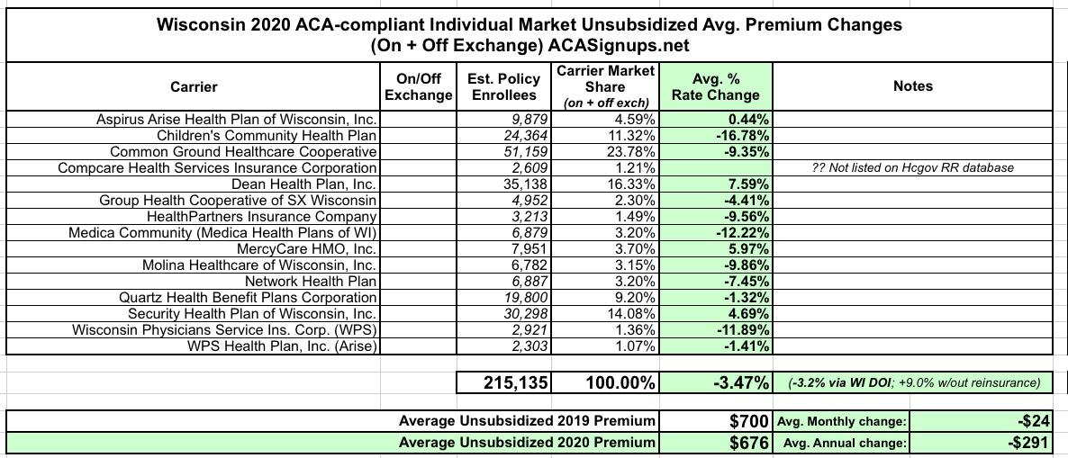 Wisconsin: *Final* avg. 2020 premium rate changes: 3.2% drop thanks to reinsurance