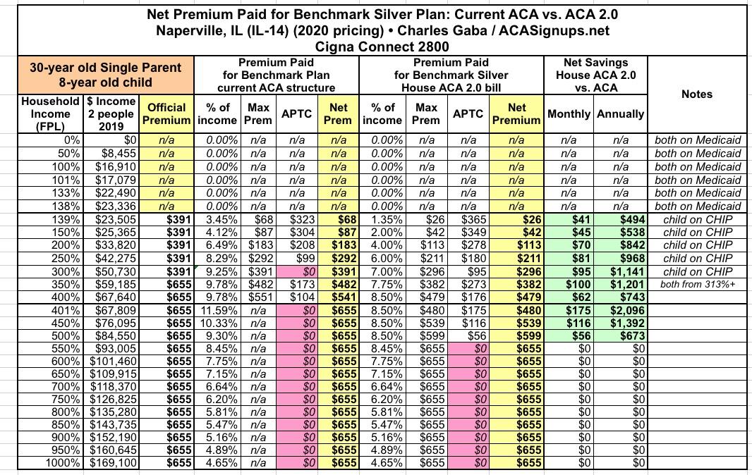 In Illinois, children qualify for CHIP up to 313% FPL, so the official premium for the parent only would only be $391 up through that point...but once their kid is added on, it jumps to $655/month. Under H.R.1868, they'd save up to $2,100/yr.