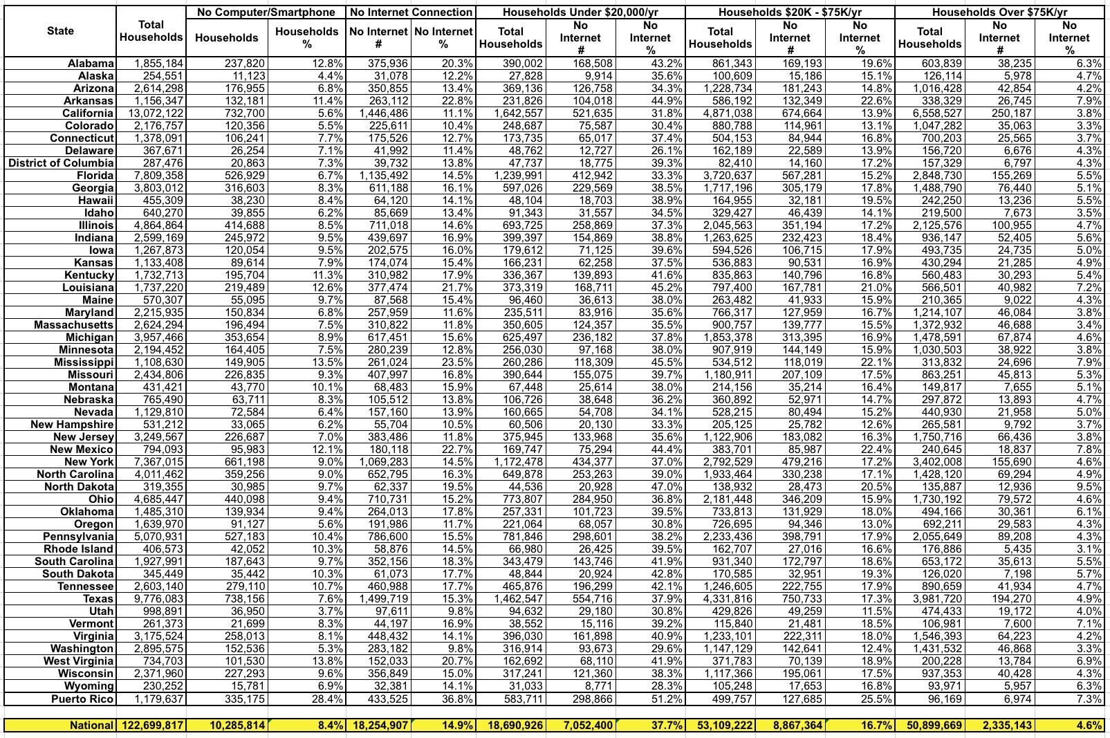 One bit of good news is that the 13% national figure is a 5-year average; obviously a lot has changed tech-wise over the past few years. According to the 2018 one-year ACS estimates, this figure was down to 8.4% last year. Here's a breakout of the numbers and percentages by state: