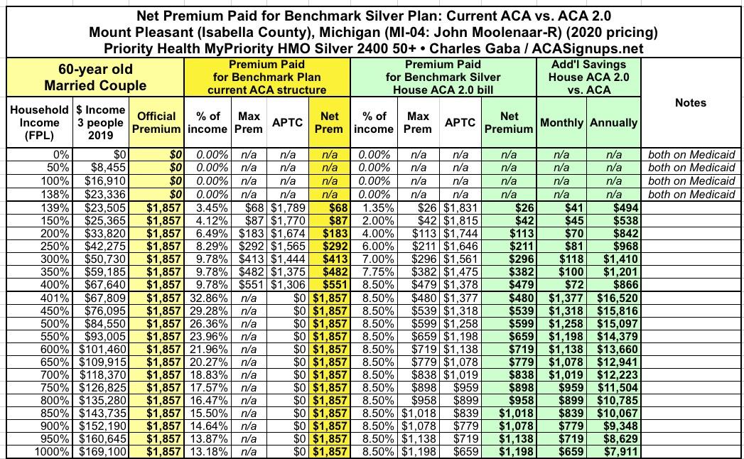 Under ACA 2.0, again, they'd pay no more than 8.5% in premiums, reducing their net premiums from $1,857/month down to as little as $480/month, a reduction of a whopping $1,377/month or over $16,500/year.