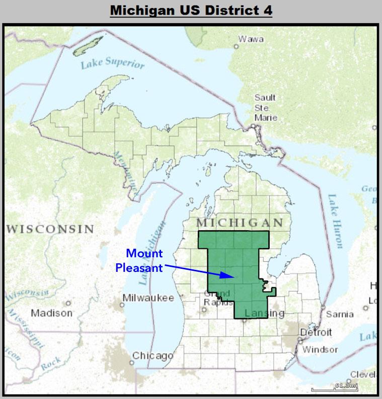 Michigan's 4th district, MI-04, covers most of central Michigan. The highest-population zip code in the district is located in Mount Pleasant, MI, in the heart of Isabella County. MI-04 is represented by Republican John Moolenaar.