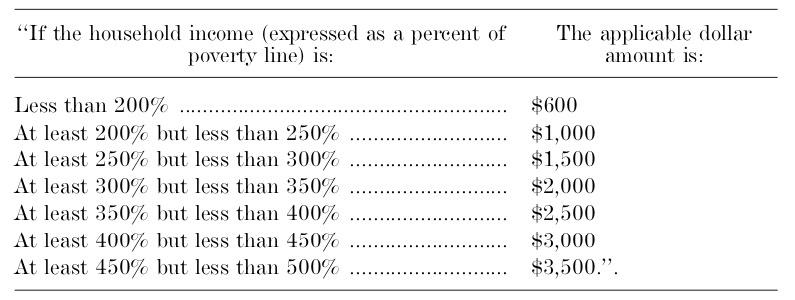 ‘‘(i) IN GENERAL.—In the case of a taxpayer whose household income is less than 500 percent of the poverty line for the size of the family involved for the taxable year, the amount of the increase under subparagraph (A) shall in no event exceed the applicable dollar amount determined in accordance with the following table (one-half of such amount in the case of a taxpayer whose tax is determined under section 1(c) for the taxable year):