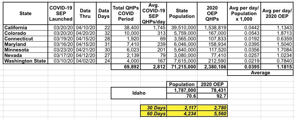 With all of this in mind, for Idaho specifically, I've decided to be a lot more cautious by running the numbers a little differently: I've used the actual COVID SEP enrollment data I have from seven of the other state-based exchanges offering them to see how many people actually have been enrolling utilizing them (the other five haven't provided their enrollment numbers yet). Here's what it looks like: