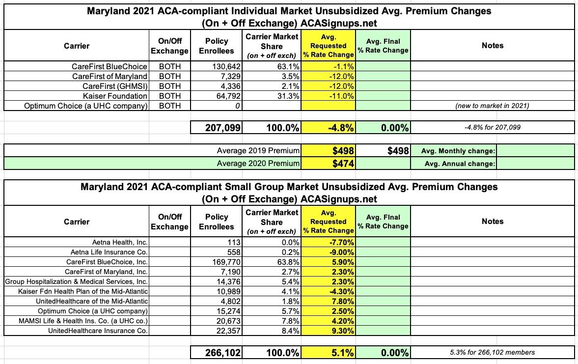 Maryland: Preliminary avg. 2021 #ACA premiums: 4.8% decrease for indy market, 5.3% increase for sm. group