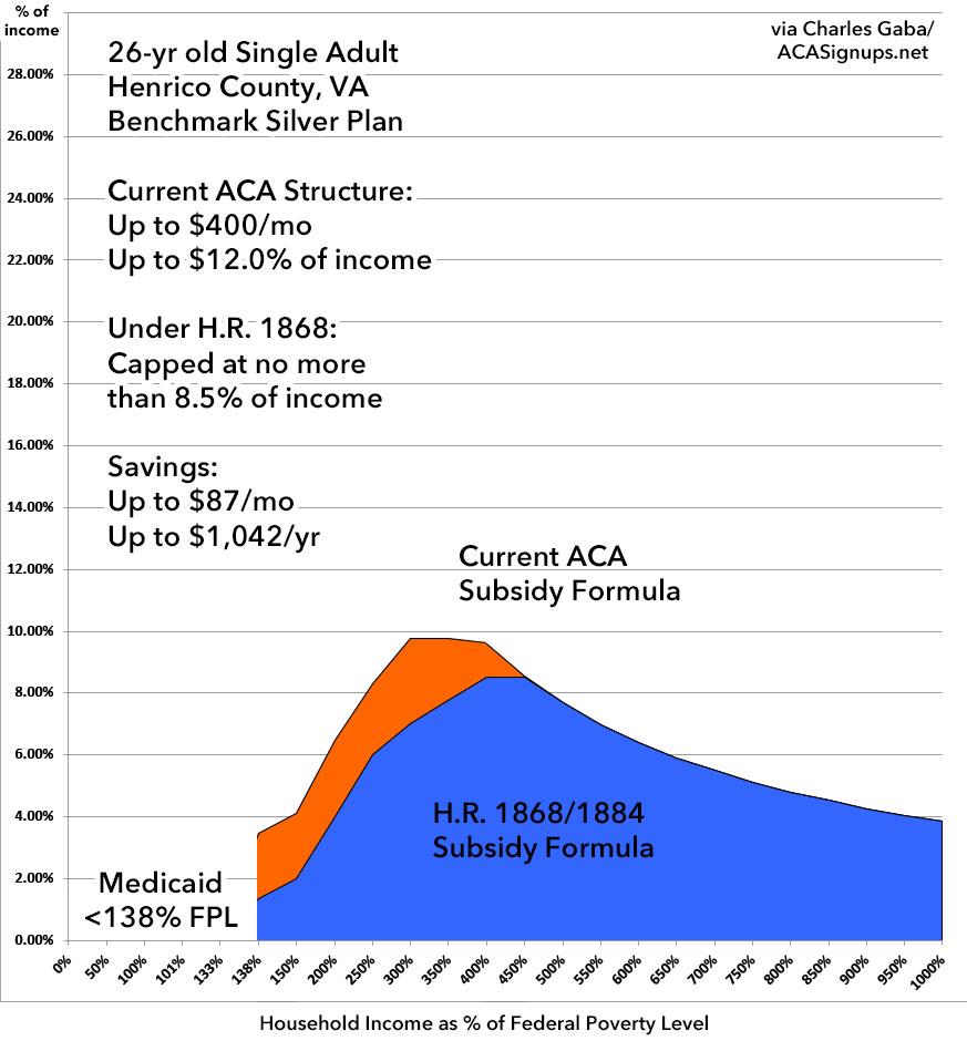 In 2020, for a single 26 year old, the benchmark Silver plan in Henrico County, VA runs exactly $400/month at full price. If they earn less than 138% FPL (around $17,200/year), they're eligible for Medicaid thanks to the ACA expanding the program. Between $17,200 - $50,000/year, they currently pay somewhere between $50/mo and full price. Since $400/mo never quite hits 9.78% of their income anyway, there isn't any "subsidy cliff" to speak of...but H.R. 1884 would still save them up to $87/month or up to $1,000/year: