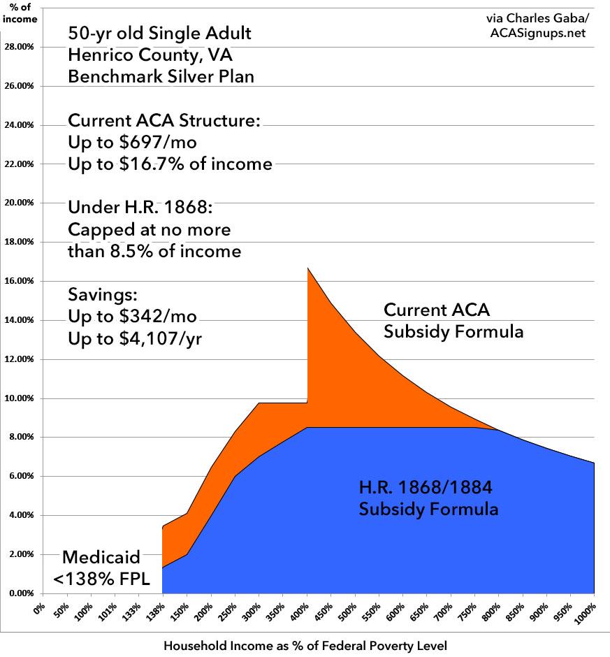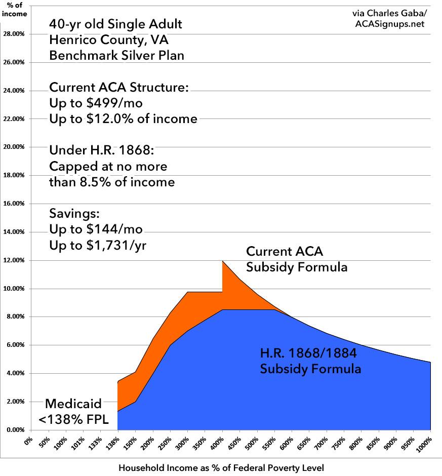 • Second, it makes the underlying formula for the tax credits more generous: Instead of the maximum amount the enrollee has to pay for a benchmark Silver plan ranging from around 2.1% of their income up to around 9.8%, H.R.1868 would drop this down to between 0% - 8.5% of income at the outside.