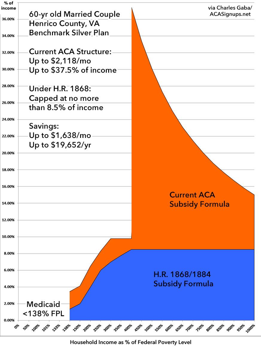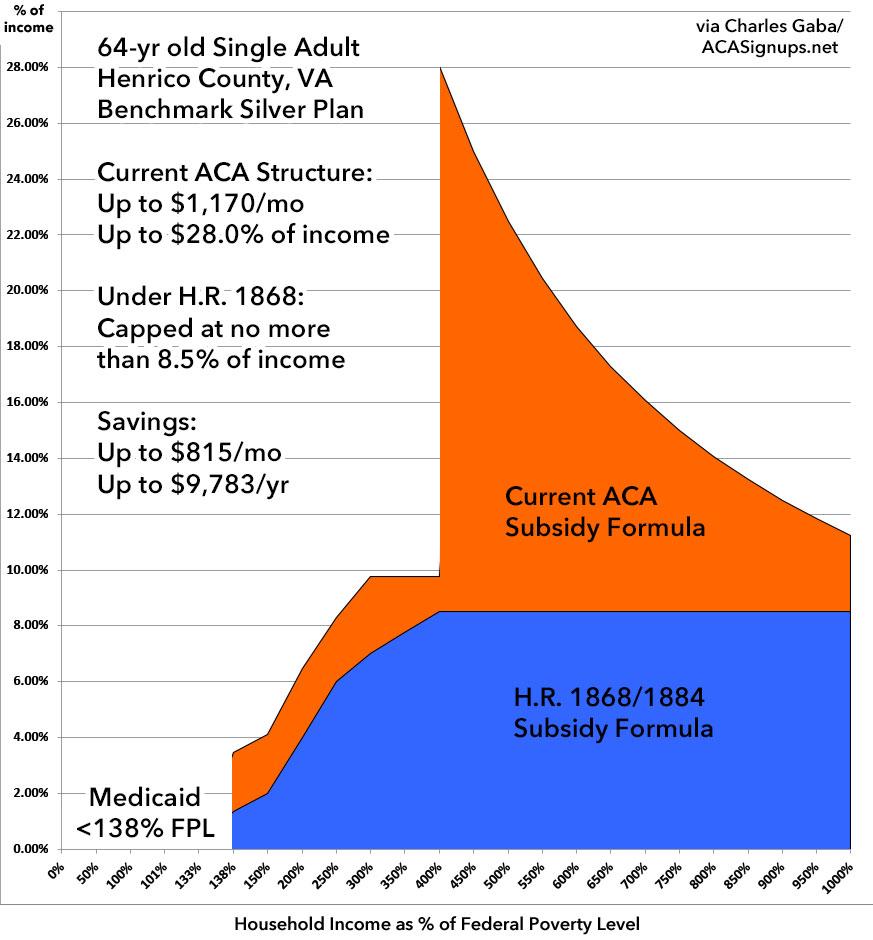 How about a 64-year old adult watching their calendar until they turn 65 and can transfer onto Medicare? Here's where the Subsidy Cliff becomes a Chasm: Under the current structure, the 64-year old would go from being capped at 9.8% of their income just below $50K/year to a whopping 28% of that as soon as their income moves even $1 over the line. Under H.R. 1868/1884, this would be reduced to no more than 8.5% of their income saving them as much as $815/month or a stunning $9,800/year: