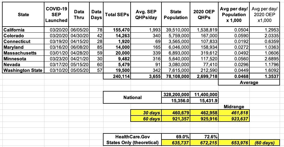 In any event, between this press release and the one earlier this week out of Maryland, here's what the COVID-19-era SEP landscape looks like across the state exchanges which have released their data (just 8 out of 13, and of course zilch from HealthCare.Gov, which hasn't been allowing a COVID-19 specific SEP):