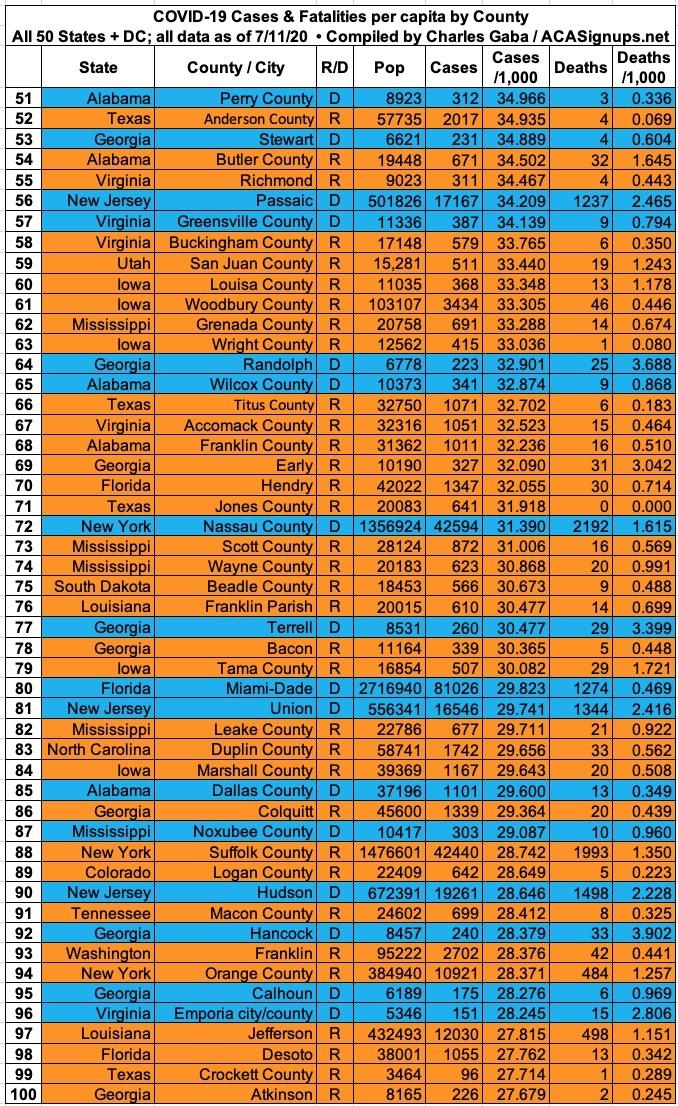 Here's the top 100 counties ranked by per capita COVID-19 fatalities as of Saturday, July 18th (click image for high-res version):
