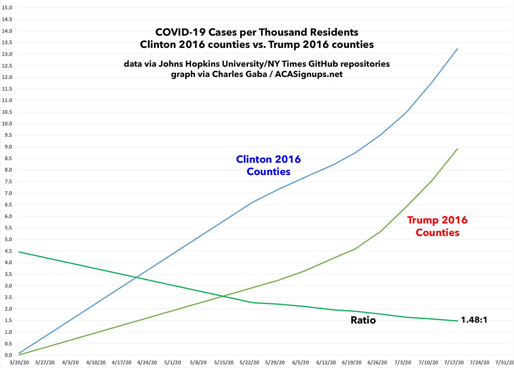 It's also worth noting how the ratio of per capita cases has shifted between the Clinton and Trump counties over time. Back in mid-March, the rate was 4.5x higher in Clinton-voting counties than Trump counties. As of this weekend that ratio was down to 1.6x. In terms of the mortality rate, the ratio has dropped from 5.3x to 2.7x.