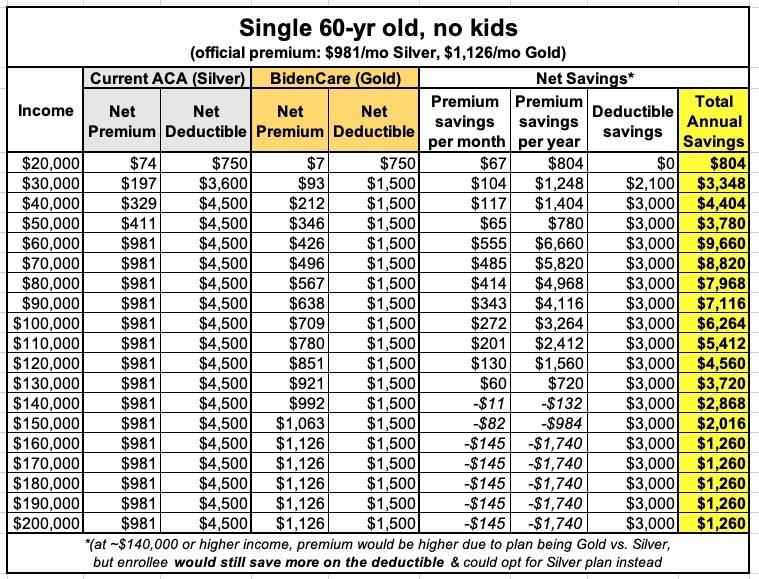 At 60 years old, the savings at lower incomes would remain the same (between $800 - $4,400/year), but middle class enrollees would save up to $9,600/year: As much as $6,600 in premiums (mostly due to the subsidy cliff being eliminated), plus the deductible being lopped down to 1/3 of the prior level.