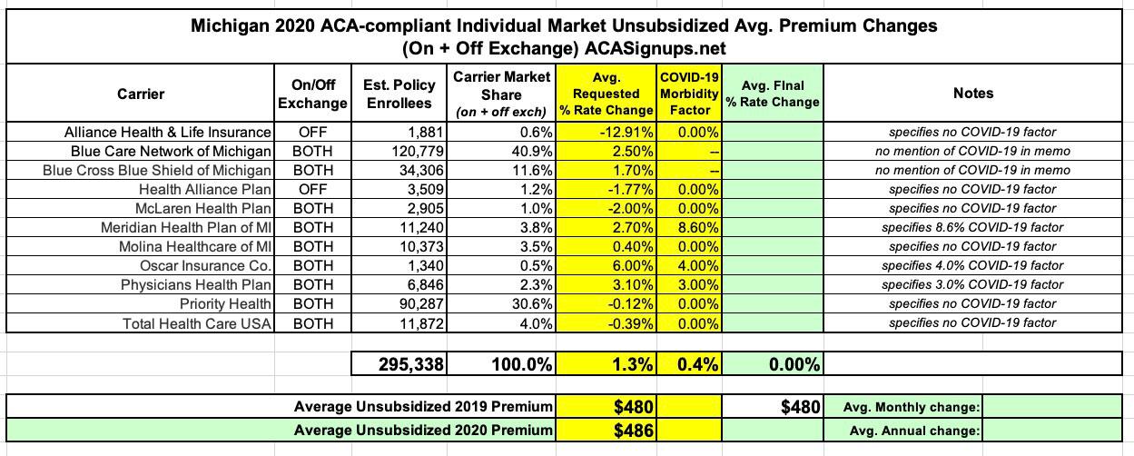All that being said, as of right now, Michigan's individual market carriers are requesting a weighted statewide average increase of just 1.3% in 2021, with COVID-19 only adding about 0.4% to the average overall: