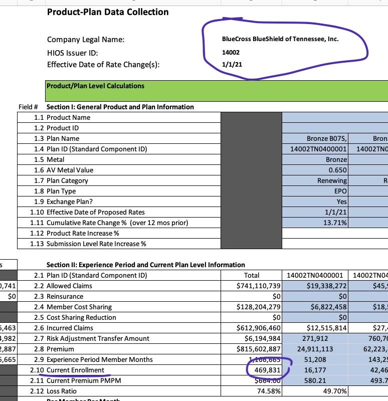 UPDATE 7/31: OK, this is very strange...I found the "Consumer Narrative" from BCBSTN, and sure enough, it only pegs their total individual market enrollment as of June 2020 as 93,000 people! This would make Tennessee's total Indy market just 190,000, which is a lot closer to what I have it pegged at (Mark Farrah Associates just pegged it at around 221,000, and that includes some number of short-term plans).