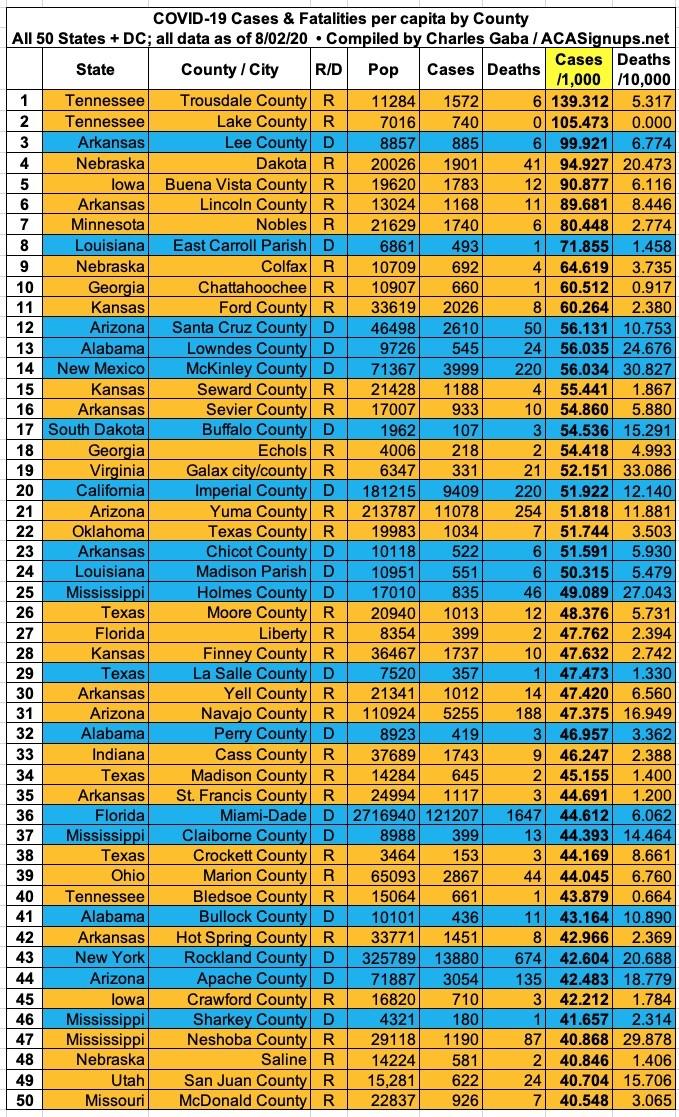 Here's the top 100 counties ranked by per capita COVID-19 cases as of Saturday, August 1st (click image for high-res version):