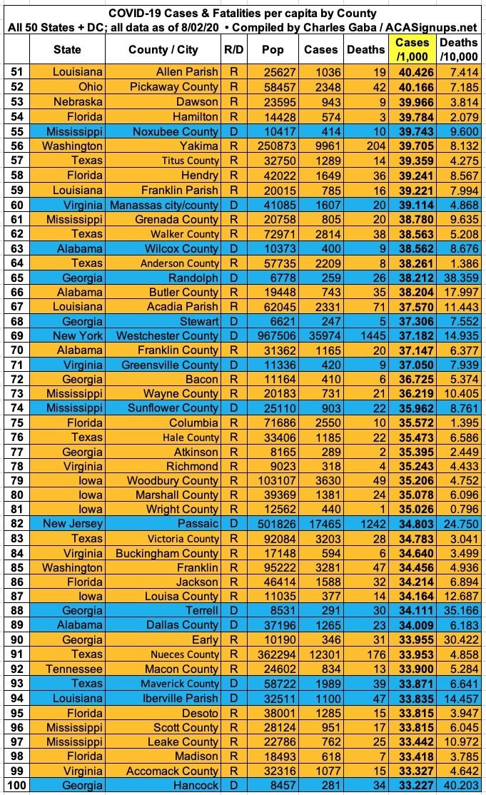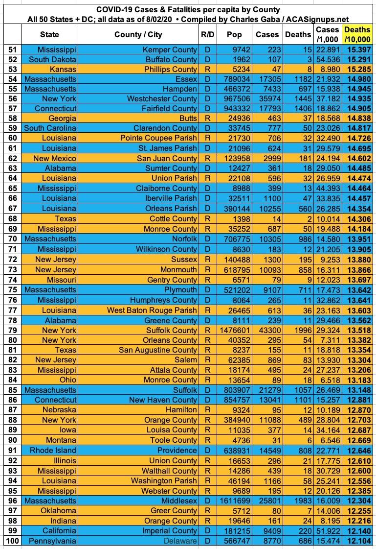 Here's the top 100 counties ranked by per capita COVID-19 fatalities as of Saturday, August 1st (click image for high-res version):