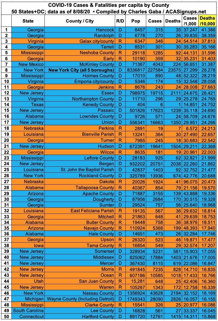 Here's the top 100 counties ranked by per capita COVID-19 fatalities as of Saturday, August 8th (click image for high-res version):