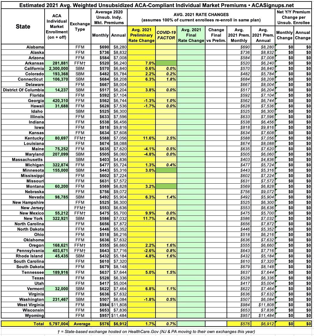 With all of this in mind, below is a table tracking the state-by-state preliminary and final rate changes for the 2021 ACA-compliant individual (and sometimes small group) markets. Scroll down for individual state entry links.